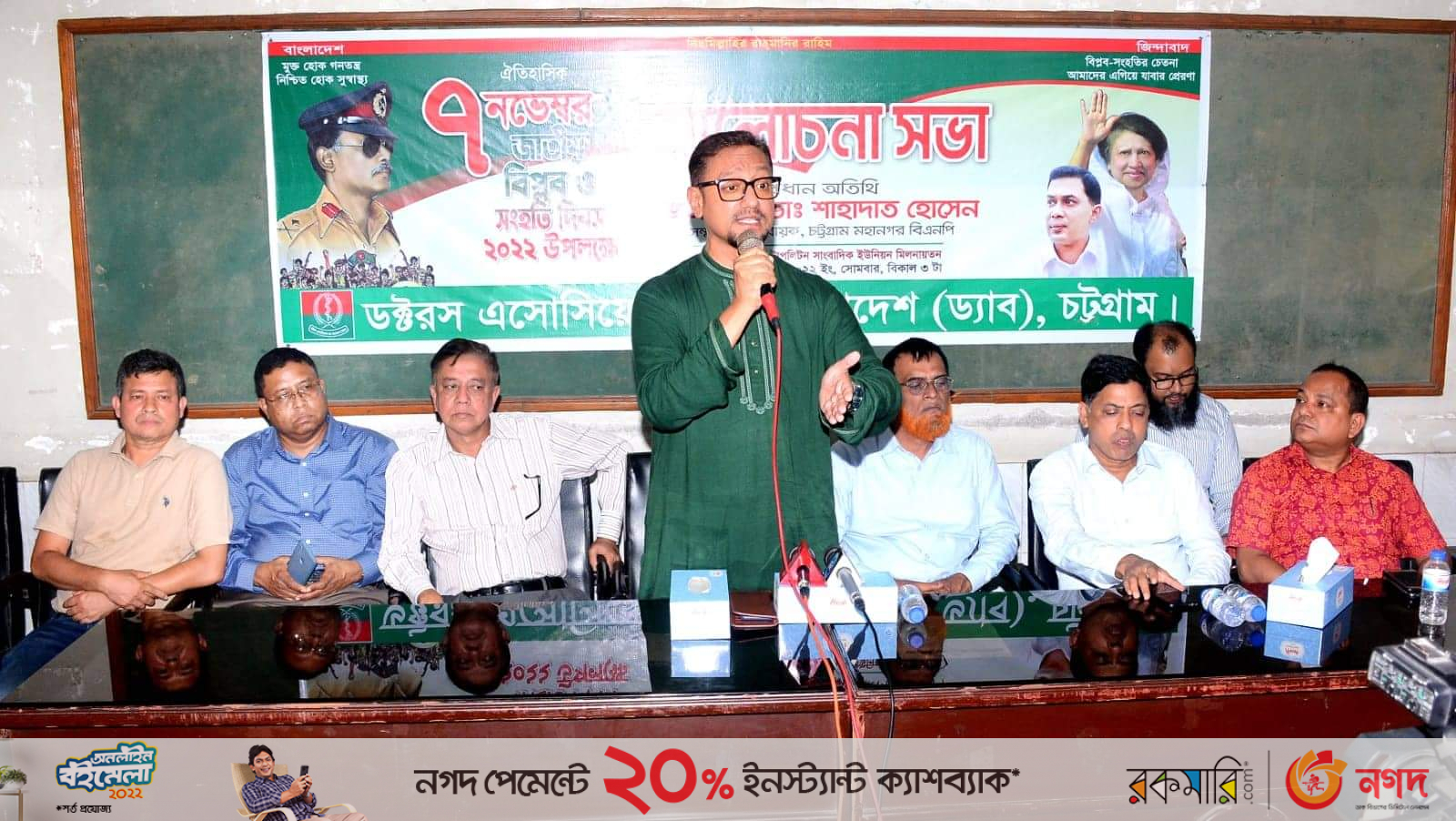চট্টগ্রাম মহানগর বিএনপির আহবায়ক ডা. শাহাদাত হোসেন বলেছেন, ৭ নভেম্বর বিপ্লব ও সংহতি দিবস বাঙালি জাতির জন্য ঐতিহাসিক দিন। ৭ নভেম্বর সিপাহী জনতার বিপ্লবের মাধ্যমে শহীদ প্রেসিডেন্ট জিয়াউর রহমানের আবির্ভাব না হলে বাংলাদেশের গণতন্ত্র, বাকস্বাধীনতা এবং এই দেশে বহুদিনের গণতন্ত্র প্রতিষ্ঠিত হতো না।