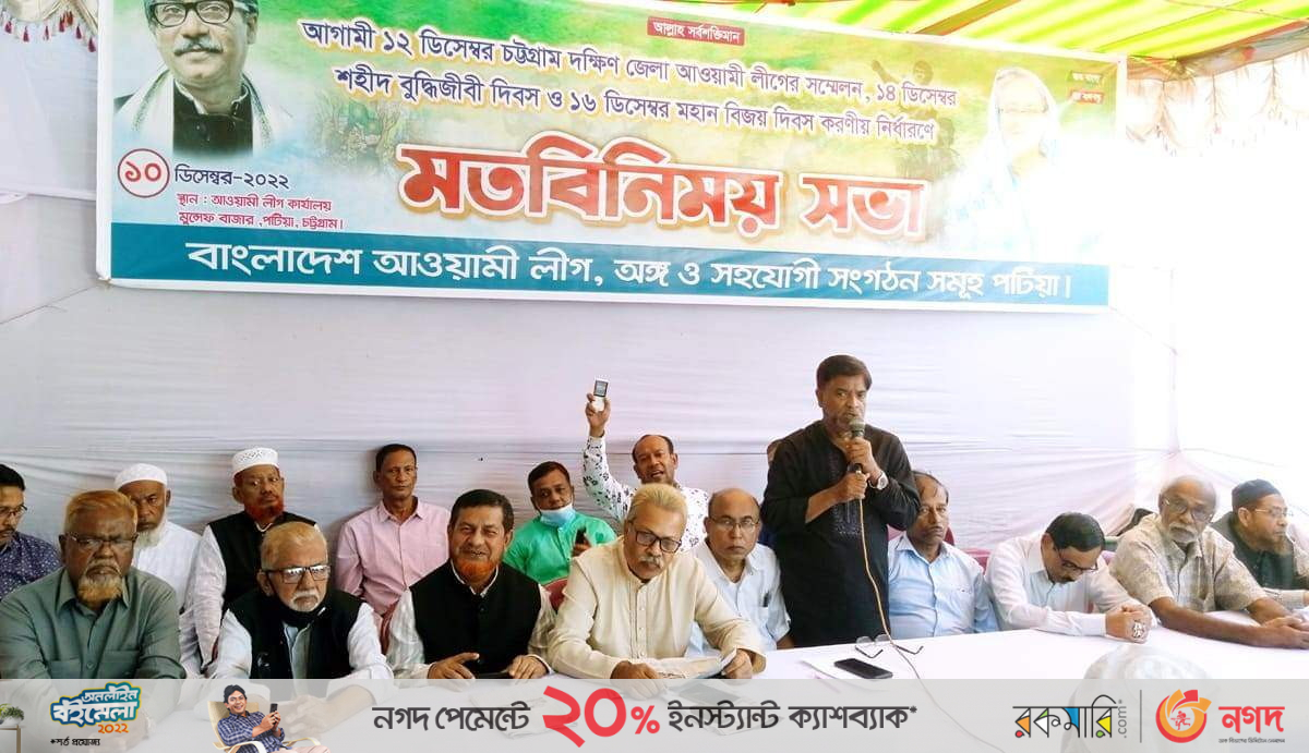চট্টগ্রাম দক্ষিণ জেলা আওয়ামী লীগের ১২ ডিসেম্বর ত্রি-বার্ষিক সম্মেলন, ১৪ ডিসেম্বর শহীদ বুদ্ধিজীবী ও ১৬ ডিসেম্বর মহান বিজয় দিবস উদযাপন উপলক্ষে পটিয়া আওয়ামী লীগ, অঙ্গ ও সংগঠনের নেতাকর্মীদের মতবিনিময় সভায় অনুষ্ঠিত হয়েছে।