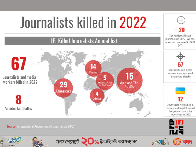 ২০২২ সালে বিশ্বজুড়ে কর্মরত অবস্থায় সাংবাদিকদের হতাহতের এক তালিকা প্রকাশ করেছে ইন্টারন্যাশনাল ফেডারেশন অব জার্নালিস্ট (আইজেএফ)। এই হিসেব অনুযায়ী এখন পর্যন্ত বিশ্বের ২১টি দেশে ৬৭ জন সাংবাদিক ও মিডিয়া কর্মী নিহত হয়েছেন। গত বছর বিশ্বজুড়ে এই সংখ্যা ছিল ৪৭।