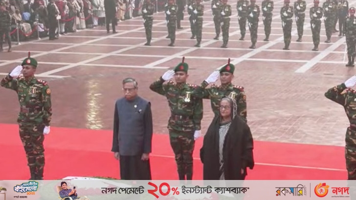 স্মৃতিসৌধে পুষ্পস্তবক অর্পণের পর কিছুক্ষণ নীরবে দাঁড়িয়ে থাকেন রাষ্ট্রপতি ও প্রধানমন্ত্রী। এ সময় বিউগলে বাজানো হয় করুণ সুর।