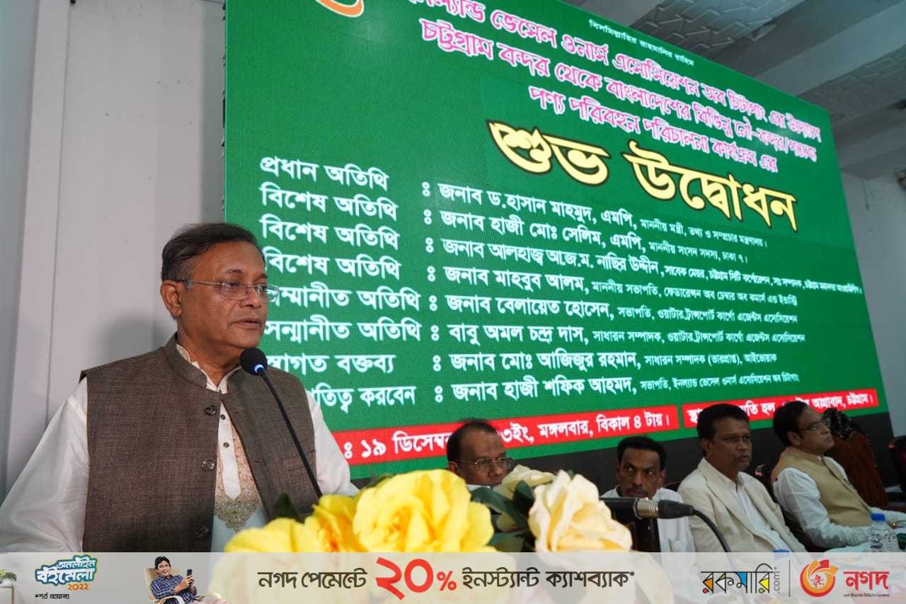 মঙ্গলবার (১৯ ডিসেম্বর) সন্ধ্যা সাড়ে ৭টায় চট্টগ্রামের হোটেল আগ্রাবাদের ইছামতী হলে ইনল্যান্ড ভেসেল ওনার্স এসোসিয়েশন অব চিটাগাং এর উদ্যোগে চট্টগ্রাম বন্দর থেকে বাংলাদেশের বিভিন্ন নৌ-বন্দর ও গন্তব্যে পণ্য পরিবহন পরিচালনা কার্যক্রমের শুভ উদ্বোধন উপলক্ষে আয়োজিত অনুষ্ঠানে প্রধান অতিথির বক্তব্যে তথ্যমন্ত্রী এসব কথা বলেন।