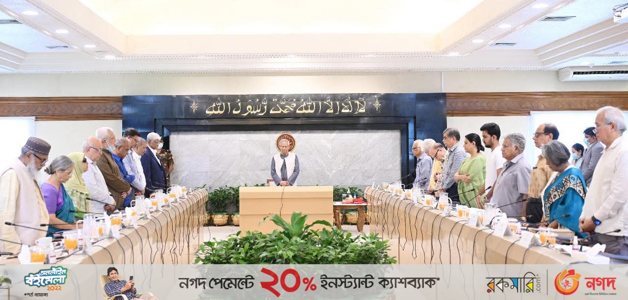বৃহস্পতিবার (২৪ জুলাই) সকালে প্রধান উপদেষ্টার কার্যালয়ে উপদেষ্টা পরিষদের নিয়মিত বৈঠক অনুষ্ঠিত হয়েছে। বৈঠকের শুরুতে মাইলস্টোন স্কুল অ্যান্ড কলেজে বিমান দুর্ঘটনায় নিহতদের স্মরণে শোক প্রস্তাব গ্রহণ করা হয়েছে, তাঁদের আত্মার প্রতি সম্মান জানিয়ে এক মিনিট নীরবতা পালন করা হয়েছে এবং নিহতদের রুহের মাগফিরাত কামনা করে মোনাজাত করা হয়েছে।