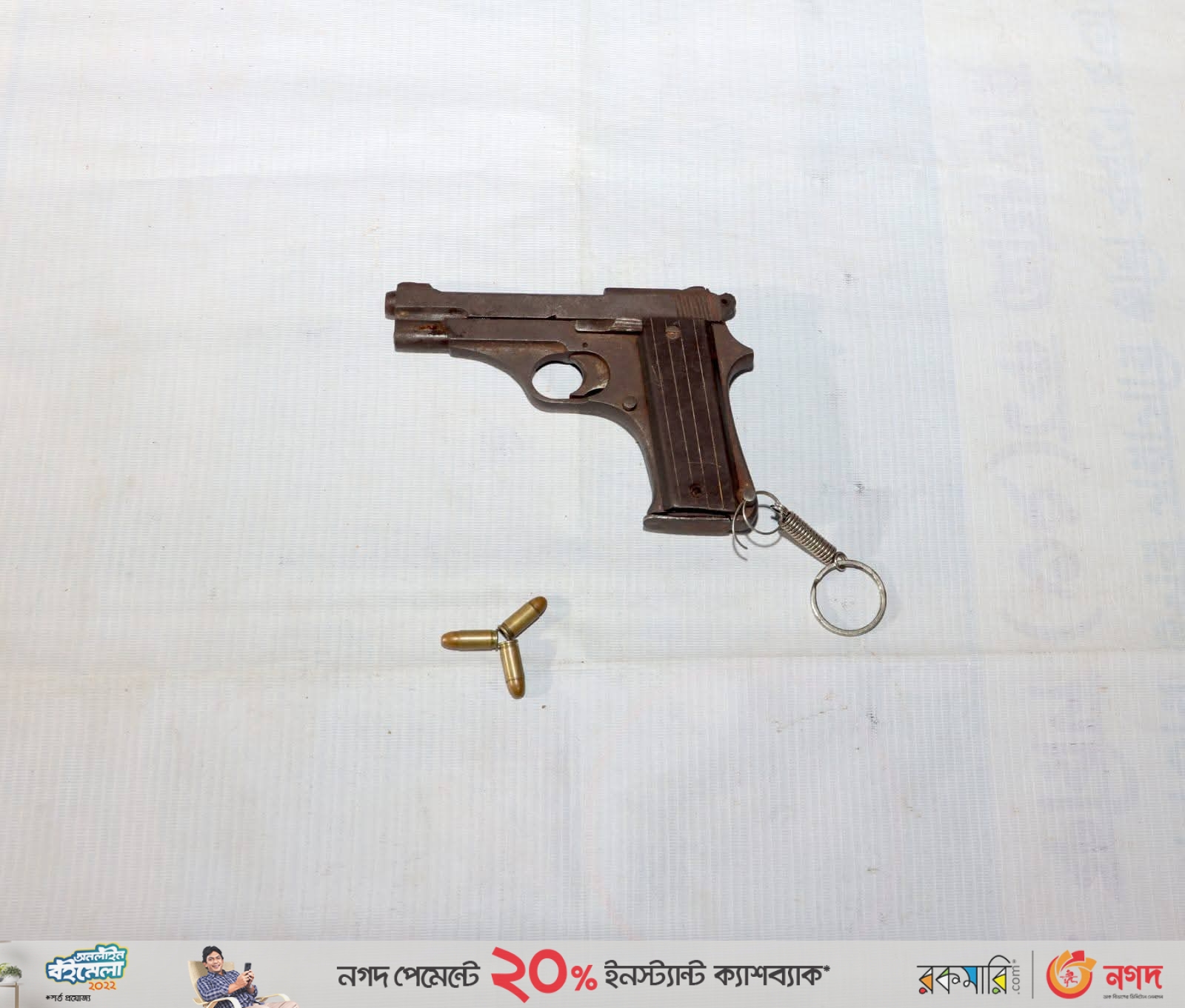 ধৃত আসামি আরও জানায়, হত্যায় ব্যবহৃত আগ্নেয়াস্ত্রটি খালের পাড়ে ইটের স্তুপের নিচে লুকানো হয়েছে। পরে অভিযানিক দল সুমনকে সঙ্গে নিয়ে ওই স্থানে গিয়ে তার দেখানো মতে খালের দেয়ালের পাশে লুকিয়ে রাখা একটি পুরাতন কালচে রঙের সচল বিদেশি পিস্তল উদ্ধার করে। পিস্তলের সঙ্গে যুক্ত ম্যাগাজিনে ছিল ৩ রাউন্ড তাজা গুলি, যার প্রতিটির পেছনে খোদাই করা আছে।