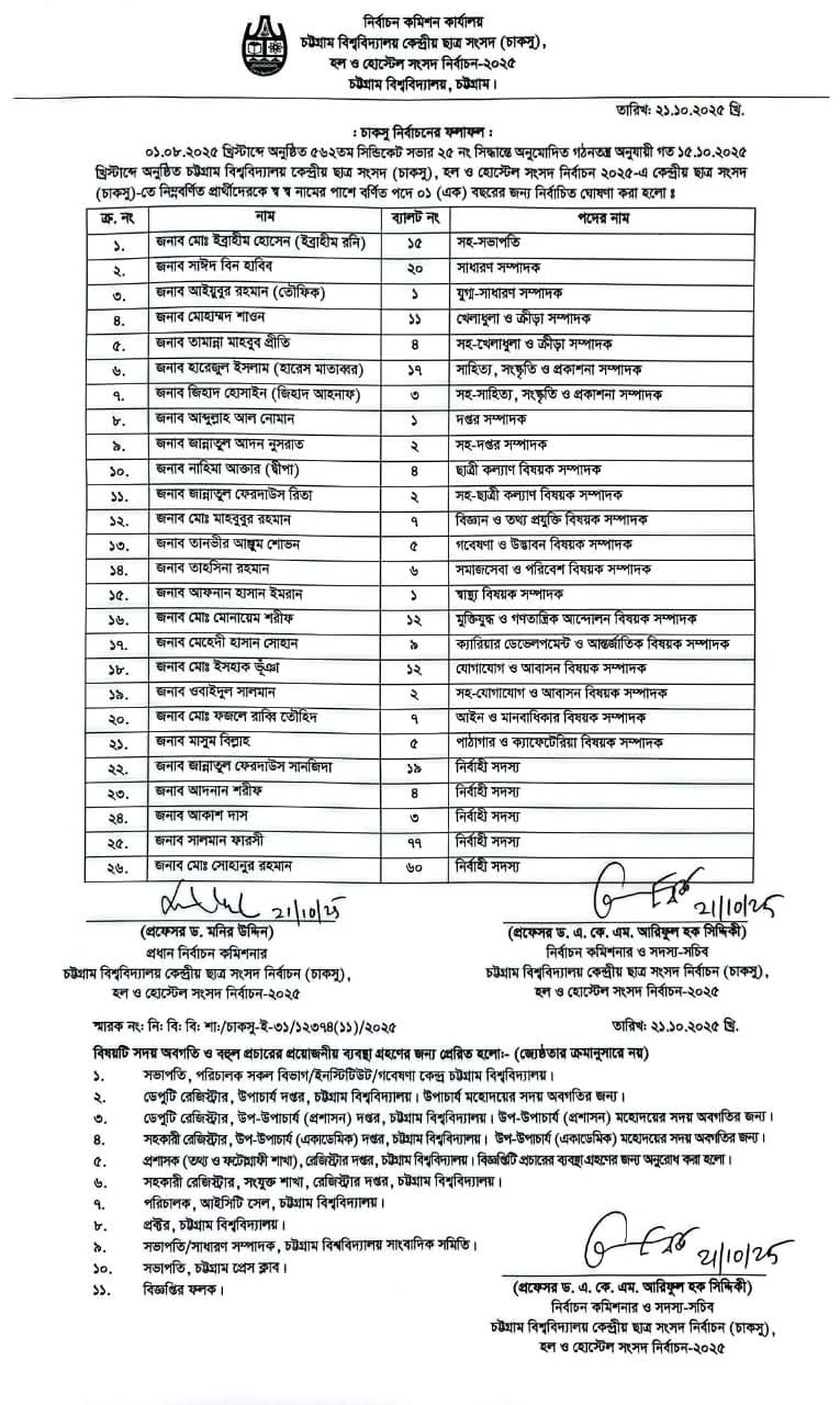 চট্টগ্রাম বিশ্ববিদ্যালয় কেন্দ্রীয় ছাত্র সংসদ (চাকসু), হল ও হোস্টেল সংসদ নির্বাচনে বিজয়ীদের গ্যাজেট প্রকাশ করা হয়েছে। মঙ্গলবার (২১ অক্টোবর) চাকসুর প্রধান নির্বাচন কমিশনার প্রফেসর ড. মনির উদ্দিন ও নির্বাচন কমিশনার ও সদস্য সচিব প্রফেসর ড. এ. কে. এম আরিফুল হক সিদ্দিকী স্বাক্ষরিত এক গ্যাজেটের মাধ্যমে বিজয়ীদের নাম ঘোষণা করা হয়। এর আগে গত ১৫ অক্টোবর চট্টগ্রাম বিশ্ববিদ্যালয় কেন্দ্রীয় ছাত্র সংসদ (চাকসু), হল ও হোস্টেল সংসদ নির্বাচন অনুষ্ঠিত হয়।
