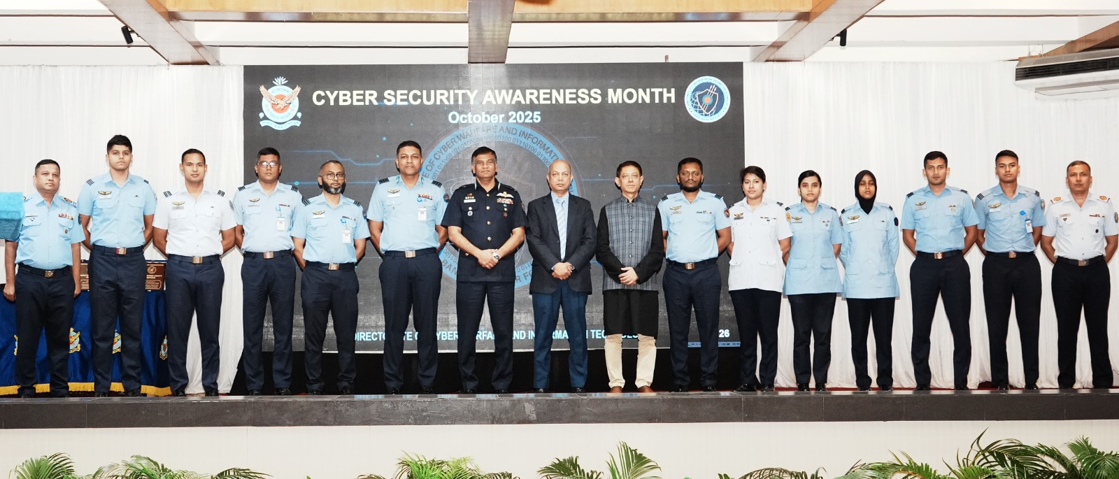 বাংলাদেশ বিমান বাহিনীর সাইবার সিকিউরিটি সচেতনতা মাস – ২০২৫ এর সমাপনী অনুষ্ঠান ২৮ অক্টোবর (মঙ্গলবার) ঢাকা সেনানিবাসে অবস্থিত ফ্যালকন হলে অনুষ্ঠিত হয়। অনুষ্ঠানে প্রধান অতিথি হিসেবে উপস্থিত ছিলেন সহকারী বিমান বাহিনী প্রধান (পরিচালন) এয়ার ভাইস মার্শাল জাভেদ তানভীর খান।