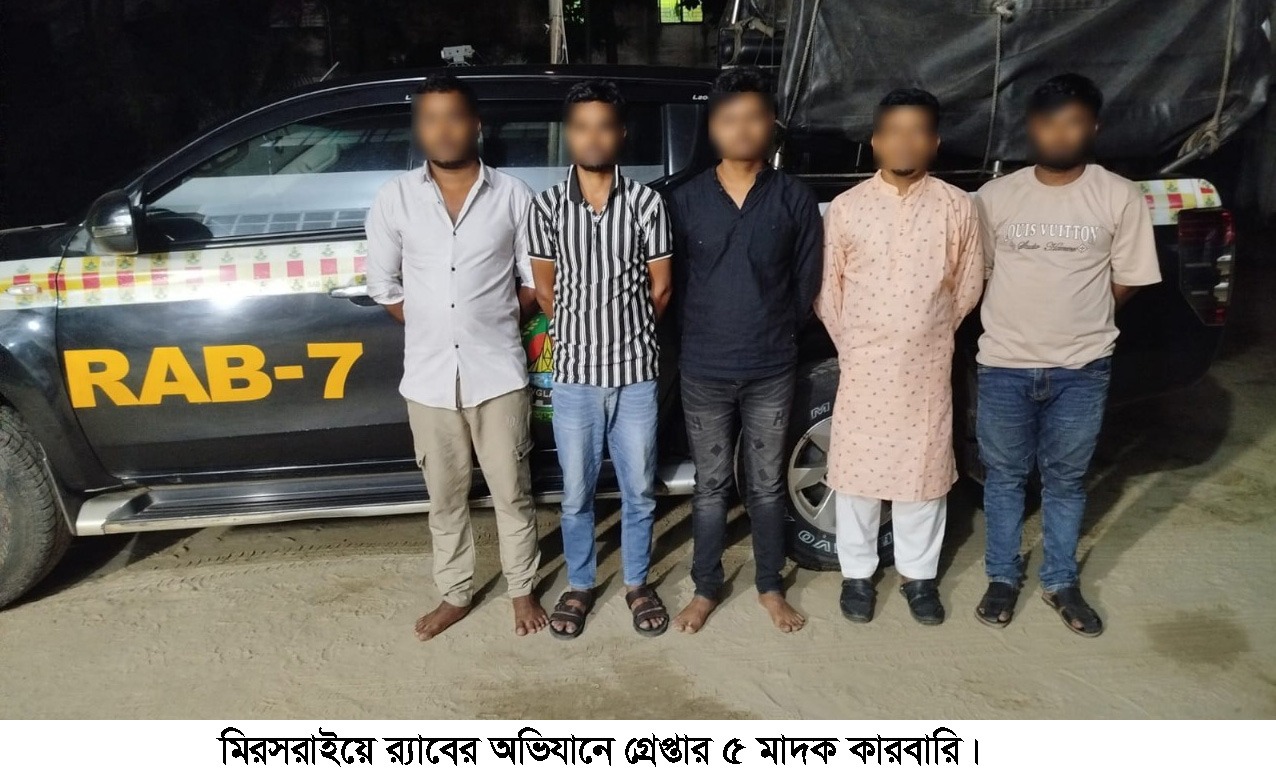গ্রেপ্তার ব্যক্তিরা হলেন— লক্ষ্মীপুর জেলার চন্দ্রগঞ্জ থানার বসুদুহিতা এলাকার আব্দুল খালেকের ছেলে মাইক্রোবাস চালক ইয়াছিন আরাফাত (২৬), বেলাল হোসেনের ছেলে মো. মিঠু (২৮), কৃষ্ণপুর এলাকার মো. জয়নাল আবেদীনের ছেলে মো. জসিম উদ্দিন (৩৯), লতিবপুর এলাকার মো. ইসমাইল হোসেনের ছেলে মো. রাজিব (২৭) এবং দেওপাড়া এলাকার মো. অজিউল্লাহর ছেলে মো. শুভ (২৪)।