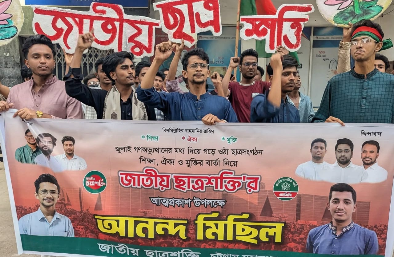জাতীয় ছাত্রশক্তির আত্মপ্রকাশ উপলক্ষে চট্টগ্রাম মহানগরে আনন্দ মিছিল অনুষ্ঠিত হয়েছে। শুক্রবার (১৪ নভেম্বর) জাতীয় নাগরিক পার্টি চট্টগ্রাম মহানগর সমন্বয়ক কমিটির সদস্য লুৎফুর রহমান রোহানের তত্ত্বাবধানে এবং জাতীয় ছাত্রশক্তি চট্টগ্রাম মহানগর শাখার সংগঠক জাওয়াদ চৌধুরীর নেতৃত্বে এ মিছিল বের করা হয়।